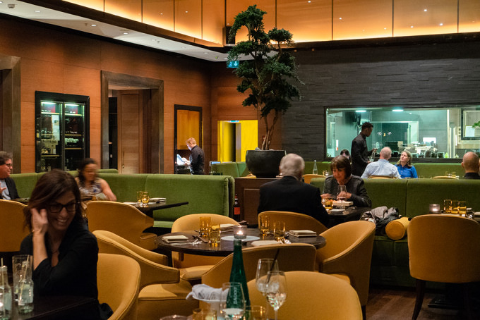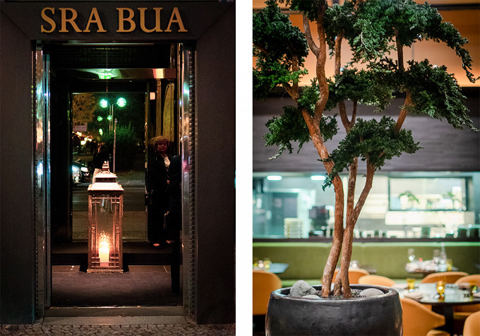 Im Sra Bua by Tim Raue (so der komplette Name des Restaurants) hat Tim Raue seiner Leidenschaft für die panasiatische Küche von Thailand über China bis Japan Form und Geschmack verliehen, was man nicht nur am Essen, sondern auch an der Inneneinrichtung merkt. Schon beim Hereinkommen fühlt man sich wie in einem kleinen Tempel, über einen langen goldenen Gang, vorbei an mächtigen Impressionen aus Asien, gelangt man in den großen Speiseraum, in dessen Zentrum ein Juniperus-Bonsai thront, die dem Raum eine machtvolle Präsenz, aber auch Ruhe verleiht. Überhaupt ist es hier trotz voller Belegung angenehm ruhig, sodass man sich voll und ganz aufs Essen konzentrieren kann.
