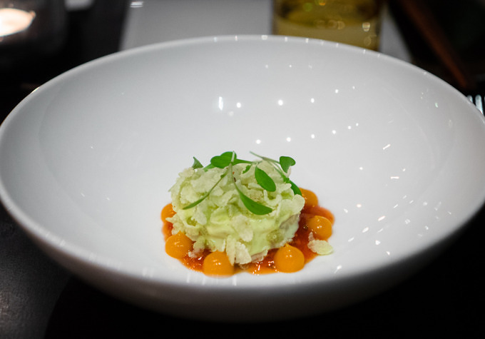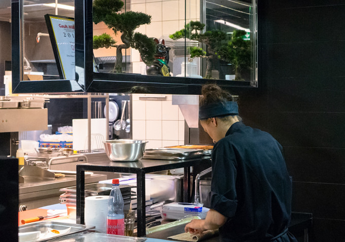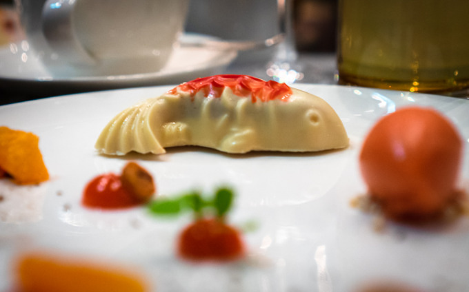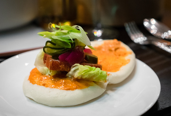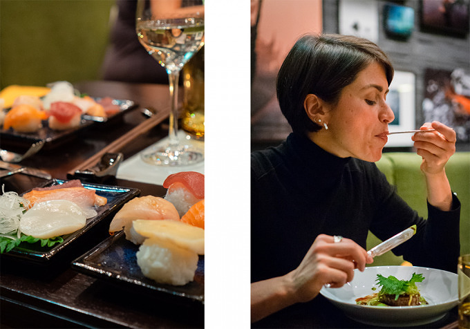 Zum ersten Gang, einer Nigiri-Variation und Sashimi, bestehend aus norwegischem Lachs, einer Jakobsmuschel aus Schottland, Thunfisch aus den Malediven und Hamachi aus dem Indopazifik, wird uns ein wunderbar samtiger Sake gereicht. Es geht weiter mit Lachs in mit Sternanis verfeinerter Tomatensauce und einer Wasabi-Garnele. Das Bao-Brötchen kann man sich selbst mit Schweinebauch, Lauch und Jalapeño belegen. Der Kalbskamm mit grünem Apfel, Erbsenpüree und einem Tamari Sekigahara Jus ist so zart, dass er auf der Zunge zergeht. Und die Gianduja-Schokolade mit Blutorangeneis und Piemonteser Haselnüsse schickt uns vollends in den kulinarischen Himmel.