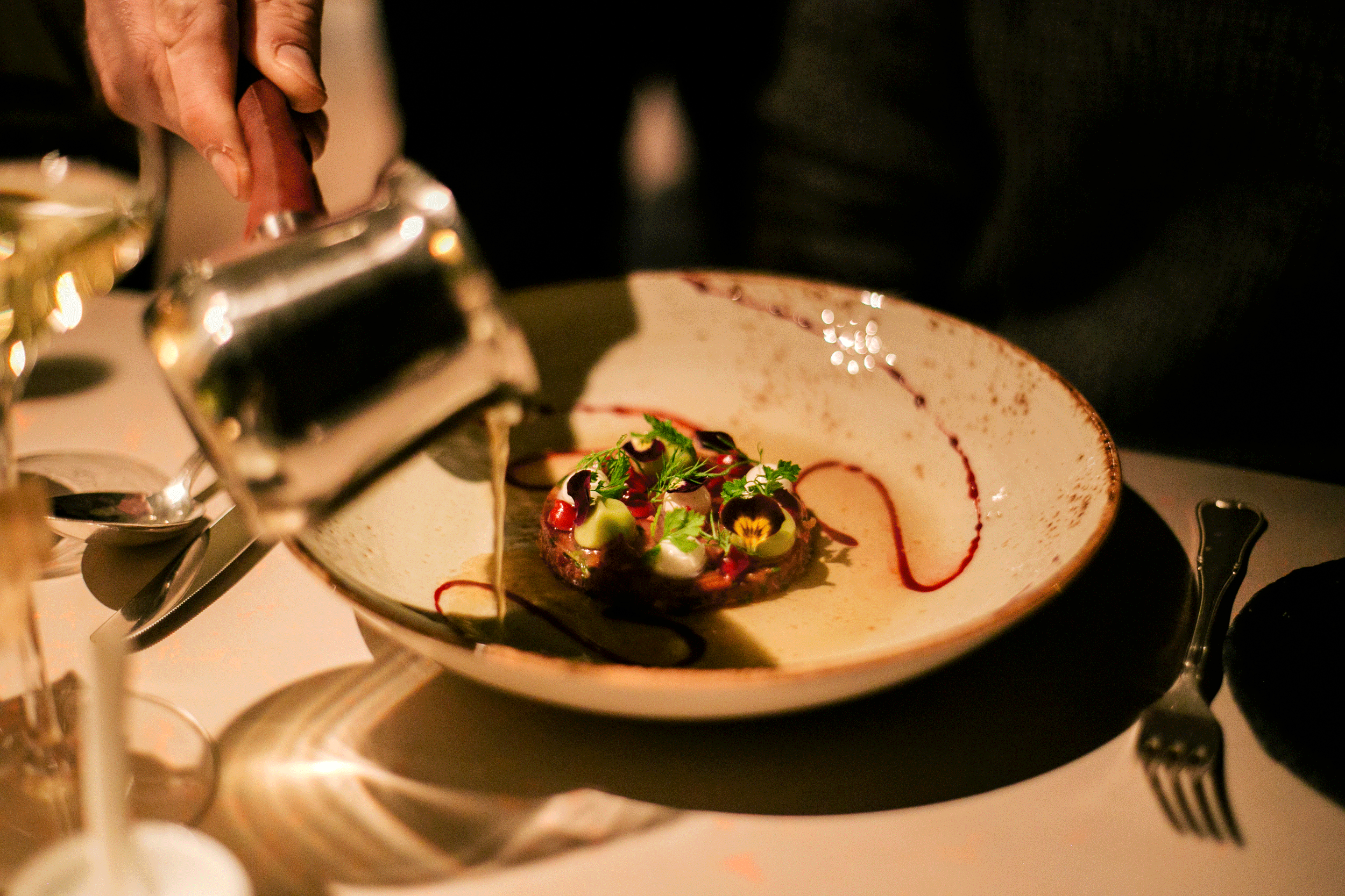 Beim Essen wollen sich die drei Jungs nicht auf eine Richtung festnageln lassen. International und lecker lautet die Devise – natürlich auf Fine-Dining-Niveau. Bereits die Vorspeisen, geklärte Soljanka mit frisch geschnittenem Rindertartar und ein Bete-Dreierlei mit Pilzsud, könnten locker in einer Folge von Chef's Table auftauchen. Küchenchef Lukas, zuletzt Küchenchef der Adlon Holding und Sous Chef im Lorenz Adlon Esszimmer, hat hohe Ansprüche.