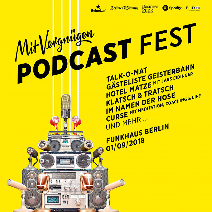 Am 1. September startet das erste große Mit Vergnügen Podcast Fest. Welche Location könnte dafür passender und eindrucksvoller sein, als das legendäre Funkhaus in der Nalepastraße? Mit dabei sind die fantastischen Podcaster von Gästeliste Geisterbahn, Klatsch & Tratsch, Hotel Matze mit Lars Eidinger, dem Talk-O-Mat, Im Namen der Hose, Toyah aber billig und Curse. Christoph Amend, Chefredakteur des ZEITmagazins und seines Zeichens Podcast-Liebhaber, wird euch durch das Programm führen und präsentiert wird der ganze Spaß von Spotify, Business Punk und FluxFM. Klingt toll?