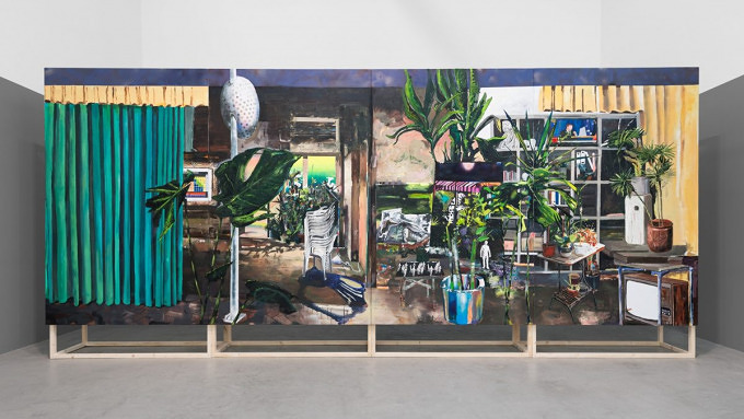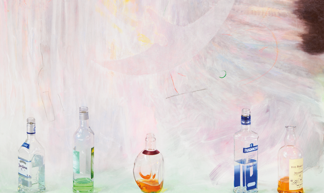Monika Baer musste sich als weibliche Malerin unter anderem gegen den Sexismus männlicher Kollegen durchsetzen; Provokateur Baselitz äußerte noch 2013, Frauen können einfach nicht malen. Baer hat, losgelöst vom eigenen Geschlecht, eine Skepsis gegenüber dieser Disziplin. Sie testet die Oberflächen und Grenzen der Leinwand, schneidet beispielsweise mal die Struktur eines Spinnennetzes hinein und malt Schlüssellöcher auf, durch die man schauen will. Ihre Gemälde haben etwas theatralisches und man möchte die ganze Geschichte kennen. "Wie war die Party?", fragt die Phantasie beim Anblick der leeren Gin-Flaschen und Zigarettenstummel.