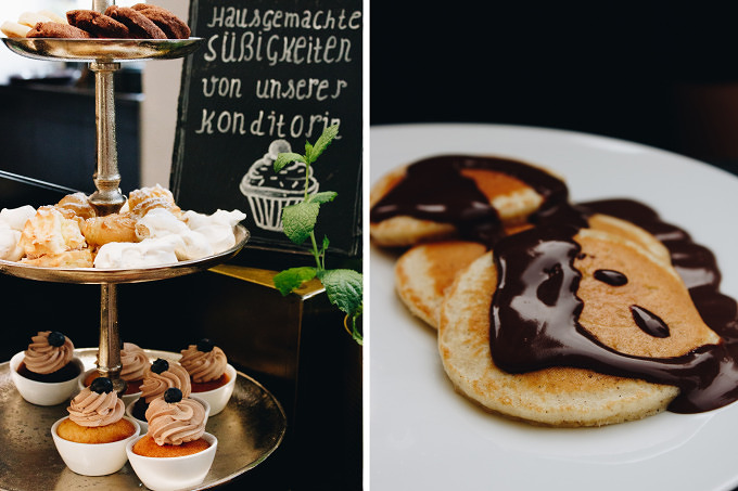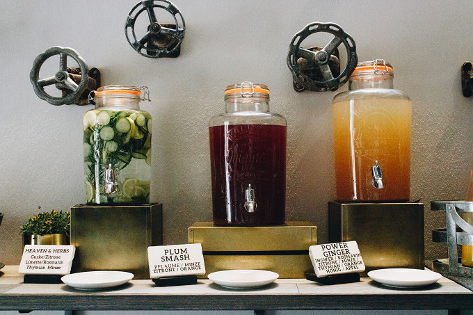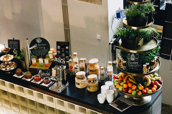 Die letzten Jahre habe ich kaum Hotelurlaub gemacht. Umso mehr freue ich mich aufs Frühstück im Hotel Oderberger. Die Theke im Restaurant wird morgens zum Buffet umgewandelt. Verschiedene Müslisorten, Marmeladen, Berliner Honig, Törtchen und Kekse aus der eignen Konditorei, frische Pancakes (auch vegan!), Käse, Wurst, vegane Aufstriche und Eierspeisen und mehr stehen bereit oder werden auf Wunsch zubereitet. Wer neben Kaffee oder Tee auch etwas kaltes trinken will, kann sich an den hausgemachten Limonaden bedienen. Wie beim Dinner, wird auch beim Frühstück auf Regionalität geachtet, so gibt es Berliner Honig und abgefüllte Säfte und Limonaden aus Kreuzberg. Außerdem verzichtet das Hotel beim Buffett auf Plastik und Verpackungen.