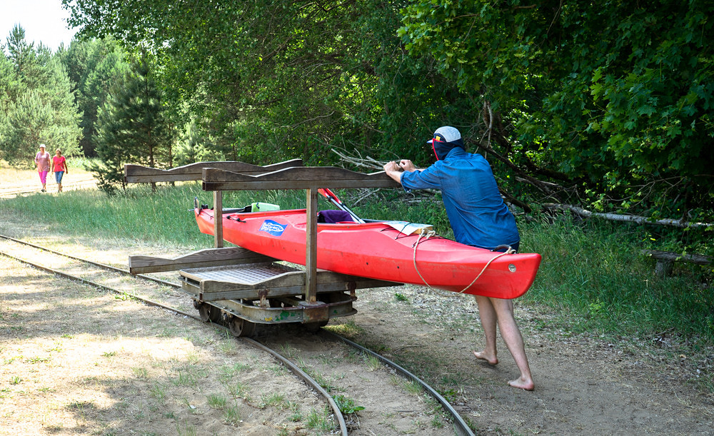 Ingo Hecht machte uns gleich am Anfang darauf aufmerksam, dass es in den meisten Seen in der Region, die übrigens wunderbar klar sind, verboten ist zu baden. Eine Ausnahme gibt es jedoch: den Pagelsee. Bevor wir uns ins kühle Nass stürzen, müssen wir jedoch noch ein kleines Hinderniss überwinden. Der Kanal, der vom Schulzensee zum Pagelsee führt, endet abrupt. Wir müssen unser Kanu mit einer Lohre ein paar hundert Meter transportieren, um zum Pagelsee zu gelangen. Beim Tragen der Kanus sind immer etwas Muckis gefragt, auf der Lohre rollt das Kanu aber von allein durch den Wald.