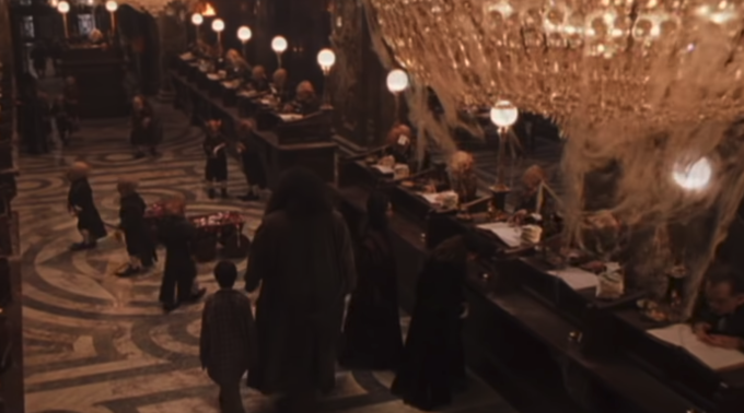 Tausende von Schornsteinen, schwarz-grün geflieste Wände und goldene Akzente: Das Zaubereiministerium sieht schon ziemlich mächtig aus. In Berlin haben wir, zumindest soweit wir wissen, zwar kein eigenes Zaubereiministerium, dafür aber den U-Bahnhof Rathaus Spandau, der mit den riesigen schwarz gefliesten Säulen und den goldenen Akzenten dem ziemlich nahe kommt.