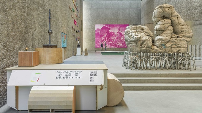 Es hieß, Kurator Kaspar König wollte seinem Sohn mal zeigen, wie man Ausstellungen macht, oder –entschärft – was man aus der großzügigen, aber auch herausfordernden Architektur der ehemaligen Kirche St. Agnes rausholen könne. Gesagt, getan: Der Altmeister hat das Potenzial voll ausgeschöpft. Er zog alte und neue Werke heran, darunter welche von Polly Apfelbaum, Thomas Bayrle, Alighiero e Boetti, Fischli/Weiss, Thomas Hirschhorn, Susi Pop und Rosemarie Trockel. Jean-Louis André Théodore Géricaults Historienbild „Das Floß der Medusa“ (1819), ein historisches Gemälde zum Thema Kannibalismus, wurde durch das Künstlerduo Susi Pop adaptiert. Das großformatige und den Raum dominierende Bild in knalligem Pink bildet eine der zwei Säulen dieser Ausstellung. Die zweite ist Albrecht Dürers „Bauernsäule“ aus dem Jahr 1525. Dazwischen passieren spannende Dialoge und Neuinterpretationen.