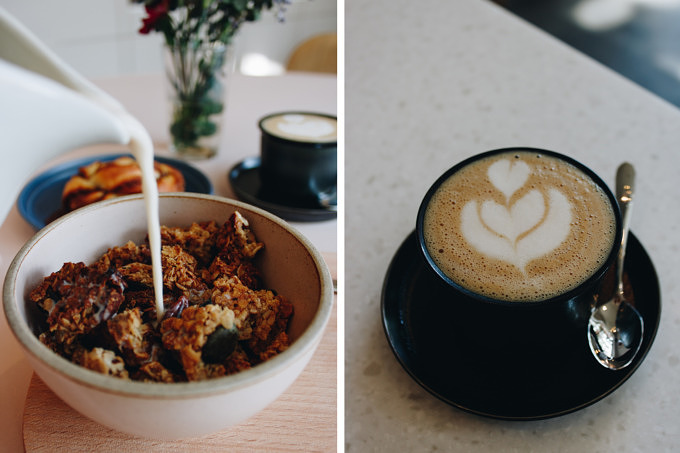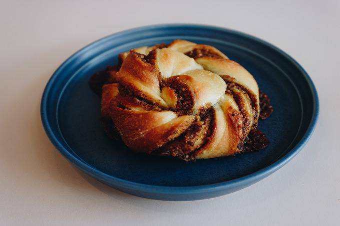 Ich bestelle einen Cappuccino mit dem schokoladig-nussigen Cerrado Espresso aus Brasilien. Auch beim Frühstück bleibe ich der Nuss treu und entscheide mich für das hausgemachte Pekannuss Granola. Weil ich bei Gebäck mit Zimt immer schwach werde, gibt's dazu noch eine Zimt Babka, die jüdische Version der schwedischen Zimtschnecke. Wer nicht so auf Zimt steht, sollte ein Schokoladen Rugelach oder das Croissant mit Lemon Curd nehmen.