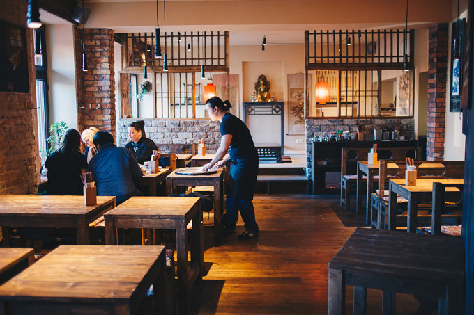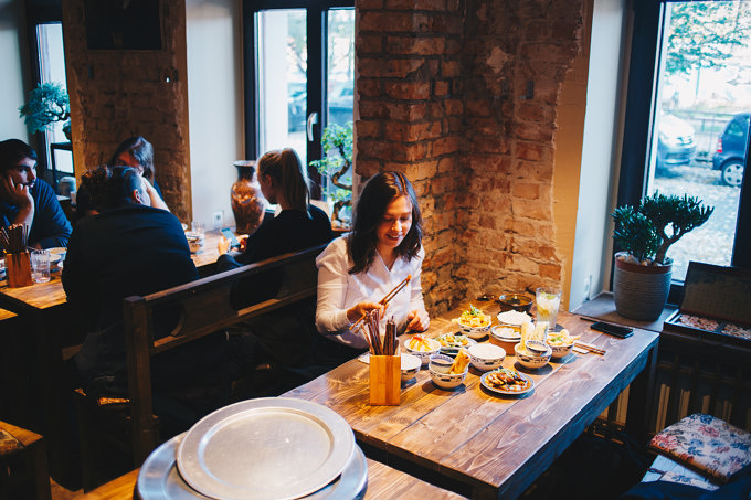 In einem wunderschönen Altbau-Eckhaus erkennt man schon von weitem die roten Lampions des Restaurants. Betritt man den Laden, eröffnet sich ein kleiner Barbereich mit hübsch gemusterten Fliesen, einer Bar aus dunklem Holz mit Regalböden, in denen rot beleuchtete Schüsseln stehen, und einem ziemlich besonderer Eingang zum Sitzbereich: Wie durch ein riesiges kreisrundes Schlüsselloch betritt man den großzügigen Sitzbereich, der von Holz und Backstein dominiert wird. Ganz hinten befindet sich außerdem ein kleiner Bereich, der mit Teppich ausgelegt ist, wo man direkt auf dem Boden sitzend futtern kann. Wir entscheiden uns für einen der großen Holztische am Fenster und bestellen einen Tee, der "Poesie der Stille" heißt und eine hausgemachte Limonade.