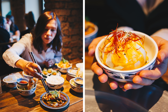 Auf der Karte gibt es neben vielen Tapas auch große Gerichte, die zweifelsohne fantastisch klingen. Wir haben allerdings andere Pläne: So viel wie möglich probieren, denn die Gerichte klingen alle so lecker, dass wir am liebsten gar keins verpassen möchten. Weil 20 Tapas uns dann aber doch ein wenig übertrieben erscheinen, entscheiden wir uns für die Klassiker wie Sommer- und Frühlingsrollen, ein gelbe Curry mit Tofu und gedämpfte Dumplings – hier hören die Gerichte allerdings auf die hübschen Namen Fliegender Kranich, Golden Dragon, Endless Love und Ha Cao. Dazu wandern ein paar Neulinge auf den Tisch: Glück vor Augen, ein gedämpfter Hefekloß mit Weißkohl-Karotten-Erbsenfüllung und Mangosoße, Beautiful Luoyang, würzige Tempura-Sojabällchen mit Seetang und Wasabi-Sojasoße, Golden Schrimmmp in einer Süß-Sauer-S0ße und Peking Duck, gebackene Sojastreifen mit Babymais, in einer Pflaumensoße.