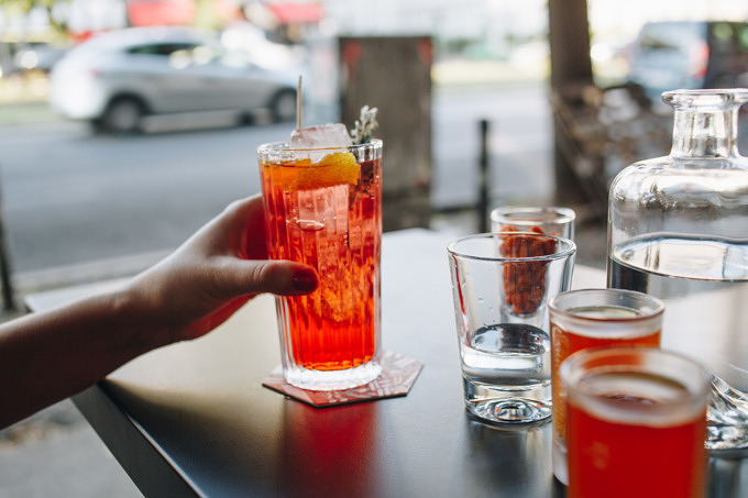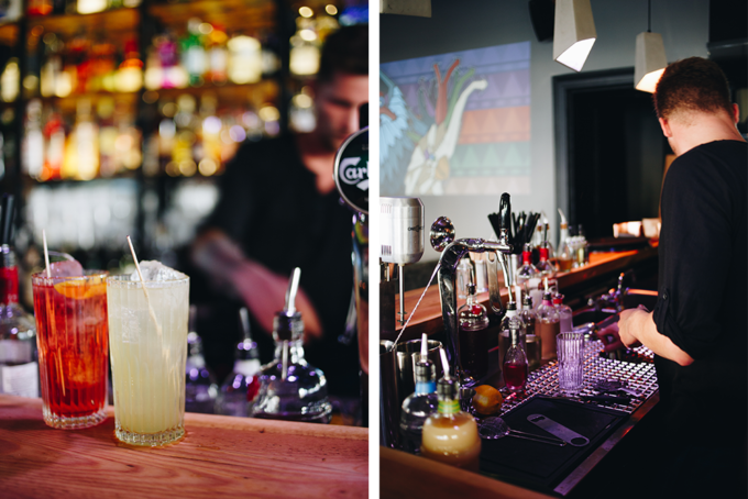 Für den Start entscheiden wir uns für den Aperosé, ein Twist des Klassikers Aperol Spritz, der statt mit Sekt mit Belsazar Vermouth Rosé zubereitet wird. "Aperol Spritz ist langweilig, die Leute lieben es aber. Deswegen wollen wir ihnen langsam zeigen, dass er auch anders super schmeckt", erklärt uns Dustin. Außerdem bestellen wir die Lieblingsdrinks der Barkeeper – wer könnte wohl bessere Empfehlungen geben als diejenigen, die die Drinks kreiert haben und täglich mixen – und vor uns landen noch "I'm in love with the Coco" und "Carmen Electric". Zugegeben, normalerweise läuten bei dem Wort Coco im Zusammenhang mit Drinks bei mir alle Alarmglocken. Ich sage nur: Swimming Pool und Pina Colada. Dieser Drink ist allerdings ganz anders, wir haben es hier nicht mit einer Kokos-Sahne-Bombe zu tun, sondern einem Drink, der aus Kokos, Aquavit, Vermouth Riesling, Dill, Zitrone, Hibiskus und Salz besteht. Bei jedem Schluck schmeckt man die feinen Nuancen der einzelnen Zutaten, er ist weniger süß, ein bisschen spritzig und angenehm leicht. Aber auch alle anderen Drinks, die wir probiert haben – uns haben es vor allem die Signature Highballs angetan – waren fantastisch.