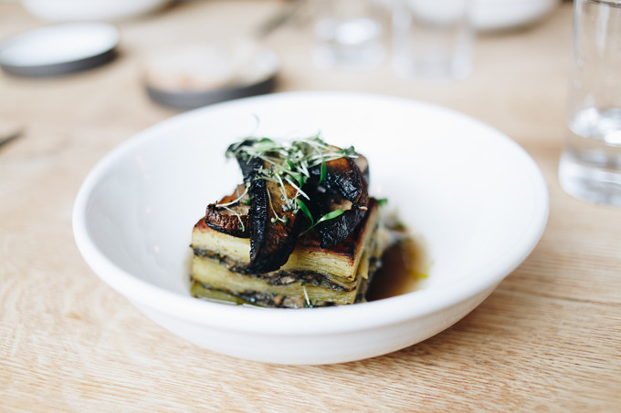 Der Gruß aus der Küche, Brot und Kimchi, ist schnell aufgegessen. David bringt uns noch eine Portion Bärlauch-Creme, die es sonst zum gerösteten Gemüse gibt. Ich sag es mal so: Als kein Brot mehr übrig war, hätten wir das Schälchen fast mit den Fingern leergewischt. Bei den Hauptspeisen stehen Pasta mit Kürbis und Kresse, Kartoffelterrine mit gerösteten Pilzen und Knollensellerie oder Linsenragout mit geröstetem Gemüse und Kräuterdip zur Auswahl. Wir nehmen die beiden letzten. Die Linsen wurden in Pilzbrühe gekocht und schmecken dadurch etwas intensiver. Meine Kartoffelterrine schmeckt super und ist genau das richtige Gericht für kalte Tage. Zwischen den unzähligen hauchdünnen Kartoffelscheiben sorgt ein Pilz-Kräuter-Pesto für Abwechslung. Knollensellerie gesellt sich als weiches Püree dazu und die gerösteten Pilze liegen als krönender Abschluss auf dem Kartoffelturm.