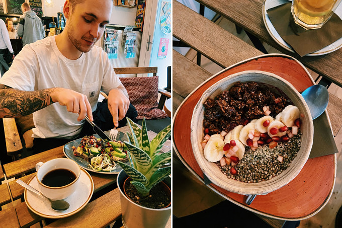 Im Café Canna zeigen Nico und seine drei Mitarbeiter*innen, was mit der Pflanze alles möglich ist. Auf der Karte finden sich eine Açai-Bowl mit Hanfsamen-Topping, zum Lunch gibt's veganen Couscous-Salat oder Buddha-Bowl mit Hanf-Bratlingen. Zum Nachtisch werden verschiedene vegane Kuchen angeboten, getrunken wird mit CBD versetzter Kaffee aus den Niederlanden oder Hemponade, eine zitronige Limonade aus Hanfsaft. Nico betont, wie nachhaltig und gesund die Hanfpflanze ist: Die Samen kommen zum Beispiel aus Brandenburg und haben mit 30 Prozent einen sehr hohen Proteinanteil, sie sind also ein richtiges "Superfood", das quasi direkt vor der Haustür wächst.