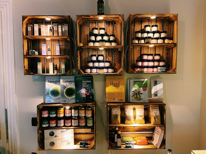 Das leckere Essen und die Getränke stehen zwar im Vordergrund, aber in den Regalen aus Weinkisten, die an den Wänden hängen, finden sich auch zahlreiche andere Produkte: CBD-Öl in verschiedener Konzentration (5%, 10% und 15%), CBD-Cremes, Tee aus Hanfblüten, Bücher zum Thema Hanf und viele andere nachhaltige Produkte wie Coffee-To-Go-Becher.