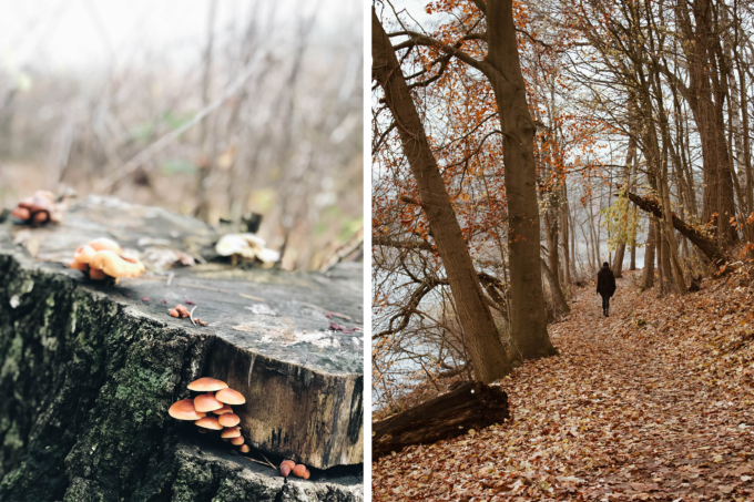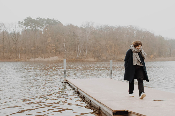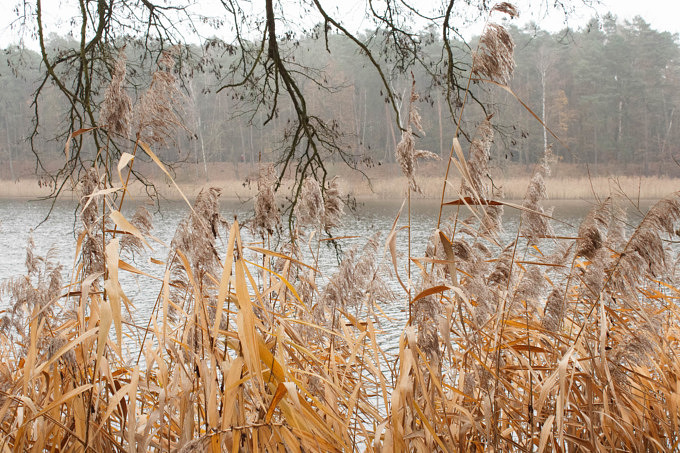 Auch wenn der graue Himmel heute kaum von dem ruhigen, ebenfalls grau getrübten Wasser zu unterscheiden ist, das bunte Laub und das gelbe Schilf tauchen die Landschaft in eine warme Herbstkulisse. Wir begegnen keinen Menschen (außer einem Angler am Steg), hören nur das Rascheln unserer Schritte im Laub und genießen die Ruhe und die frische Luft. Die drei Kilometer einmal um den See legt ihr über einen Weg zurück, der die ganze Zeit am Wasser entlang führt. Wir entdecken Bucht für Bucht, die sich hinter dem Schilf verstecken.