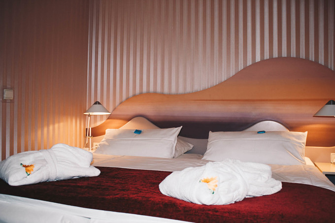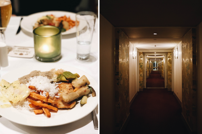 Ihr könnt euch vorstellen, dass zwei gute Esserinnen wie wir von allem probieren mussten und zum Schluss quasi auf unser Zimmer gerollt sind. Die Auswahl ist reichhaltig, sowohl Vegetarier*innen als auch Veganer*innen kommen hier voll auf ihre Kosten. Ihr habt natürlich auch die Wahl à la carte im hauseigenen Restaurant "Kranich & Frosch" zu bestellen. Der Speisesaal und der Rote Salon scheinen ein bisschen wie aus der Zeit gefallen, der Stil lässt sich am ehesten als buntes Potpourri beschreiben, eine Mischung aus 80ern, 90ern und modernen Elementen. Bei mir kommt ein vertrautes Gefühl von früher auf, als man sich im Urlaub abends zum Dinner in Schale geschmissen und sich am Büffet meistens viel zu oft nachgenommen hat. Wer kennt's?