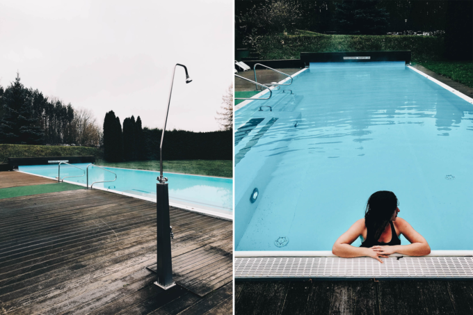 Ihr braucht an nichts weiter denken, denn Handtücher für die Saunagänge, Kalt- und Warmgetränke für zwischendurch sowie Lesestoff gibt es vor Ort. Ihr könnt zwischen der Finnischen Sauna, dem Sanarium oder einem Dampfbad und verschiedenen Aufgüssen wählen. Zudem gibt es ein Kneipbad, um die Durchblutung der Füße und Beine zu fördern, und einen Eisbrunnen. Nach der Sauna bin ich direkt in den Pool gesprungen, um noch ein paar Bahnen zu schwimmen. Herrlich ist das – auch wenn es draußen frisch und kalt ist, denn der Pool ist beheizt. Danach heißt es weiter entspannen. Mit einem guten Buch und einem warmen Tee machen wir es uns auf den Liegen gemütlich und genießen die letzten Stunden, bevor es für uns heißt, unsere sieben Sachen zusammenzupacken und die kurze Heimreise nach Berlin anzutreten.