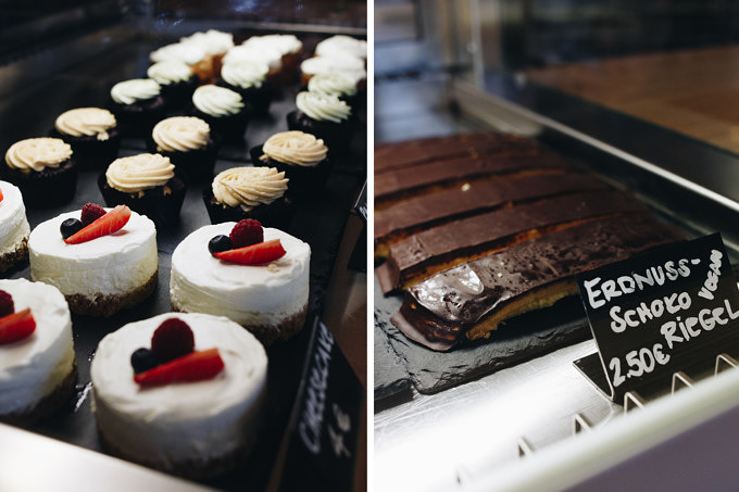 Veggie: Smoothie Bowl, Bircher Müsli, Quinoa-Dinkel Croissant und zwei der belegten Brote (Avocado & Sprossen und Kokoscreme mit Feige, Agavendicksaft und Sonnenblumenkernen) sind vegan.