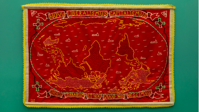 Karten waren schon immer alles andere als nur ein objektiver Navigator. Was wie abgebildet wird, ist immer eine Entscheidung und oft eine politisch motivierte. Eine Karte richtig zu deuten, verlangt daher danach, die Position des Autors zu verstehen. Der philippinische Künstler Cian Dayrit betrachtet die Aktivität des Kartographierens als emanzipatorischen Akt. Seine Karten überlagern kolonialistische Abbildungen, zeigen die Ausbeutung natürlicher Ressourcen, der Besetzung und Unterdrückung. Karte als Statement sozusagen.
