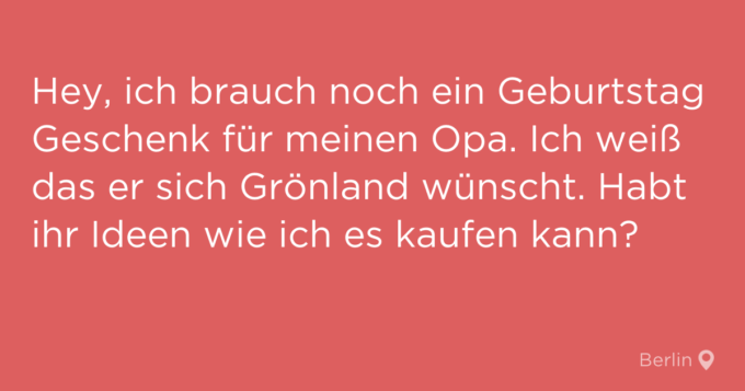 Was ist wohl die bitterste Erfahrung? Wenn du nach Berlin ziehst und merkst, dass du mit Glitzerkleid und Pumps nicht ins Berghain reinkommst? Wenn dir dein gerade eben gekaufter Snack am Kotti auf den Boden fällt? Oder wenn du realisierst, dass du Grönland einfach nicht kaufen kannst, auch wenn du es WIRKLICH dringend willst? Während ihr darüber nachdenkt, könnt ihr ja unsere Lieblingsjodel der Woche lesen.