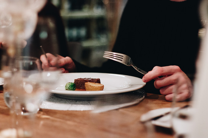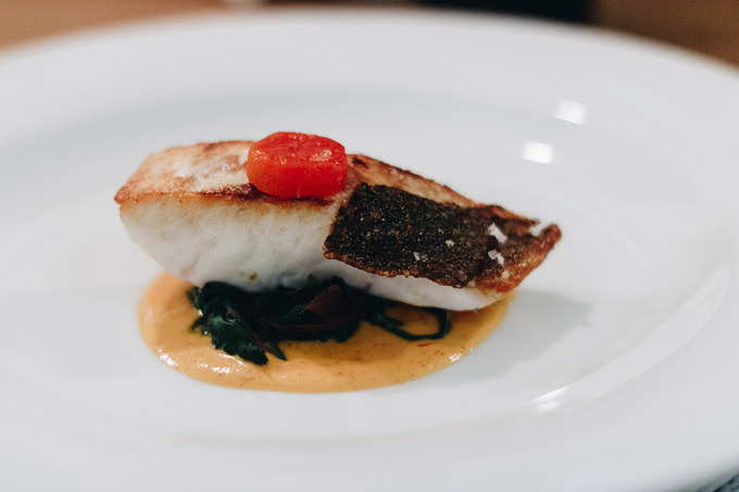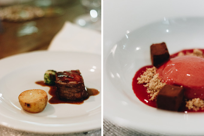 Wir sind bei den Hauptspeisen angekommen. Den Anfang macht kross gebratener Wolfsbarsch auf luftiger Romesco Soße aus Paprika und Spinat. Danach folgt Rücken vom Weiderind. Genauso zart wie das Fleisch ist auch die in Rinderfett konfierte Kartoffel, die als Beilage kommt. Die Teller bestehen, ein gutes Beispiel sind die Hauptspeise, hauptsächlich aus maximal vier einzelnen Bestandteilen bzw. Geschmäckern: Fisch, Spinat, Soße und Fleisch, Kartoffel, Rosenkohl. Obwohl, oder gerade weil die Teller eher zurückhaltend und nicht überladen angerichtet sind, kommen die einzelnen Zutaten besonders gut zur Geltung. Können des Chefkochs und Qualität der Lebensmittel spielen eine ebenso gleich große Rolle. Zum Abschluss gibt es kleine Schokoladentrüffel mit Himbeersorbet, Soße und Crumble.