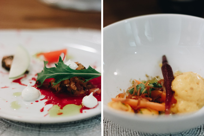 Leimers Chefkoch Sidney Adams hat vorher unter Jörg Behrend im Hotel De Rome gearbeitet und nimmt uns heute, gemeinsam mit seinem Sous Chef Börge Bening, mit auf (s)eine große Gourmetreise. Unser Sieben-Gänge-Dinner startet mit dem Roadkill Lachs. Was auf dem Teller wie ein blutiger Unfall aussieht, ist in Zitronenöl angemachtes Lachstatar auf einer Roter Beete-Reduktion mit Wasabi Sauerrahm, Wasabi Rauke und einer Scheibe grünem Apfel für die Säure. Es folgen Möhren in verschiedenen Farben und Texturen mit einem Curryschaum. Die kleinen Rüben haben Biss oder sind, in Mousseform, samtig-weich. Auf die zwei farbenfrohen Gänge folgt ein Allerlei von Semmelstoppelpilze. Sidney will verschiedenen Texturen aus einem Produkt machen und zu zeigen, wie vielfältig Gemüse sein kann. Abgerundet werden die Pilze mit Trüffel. Auch wenn sich der Teller farblich im langweiligen Grau befindet, geschmacklich ist hier viel los.