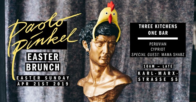 Am Ostersonntag wird im Paolo Pinkel in Neukölln gebruncht. Neben der peruanischen und der zypriotischen Küche gibt's zu Ostern auch noch pakistanische Spezialitäten von Mama Shabz. Freut euch auf Gerichte wie Huevos Racnheros mit Chorizo, Bacon und Tortilla, Fried Chicken mit Halloumi, Waffeln und Chili-Ahonrsirup oder Pakora Pancakes. Nach einem klassischen Brunch klingt das nicht, dafür aber interessant und verdammt lecker. Und wer sich als Osterhase verkleidet, bekommt auch einen Drink spendiert.