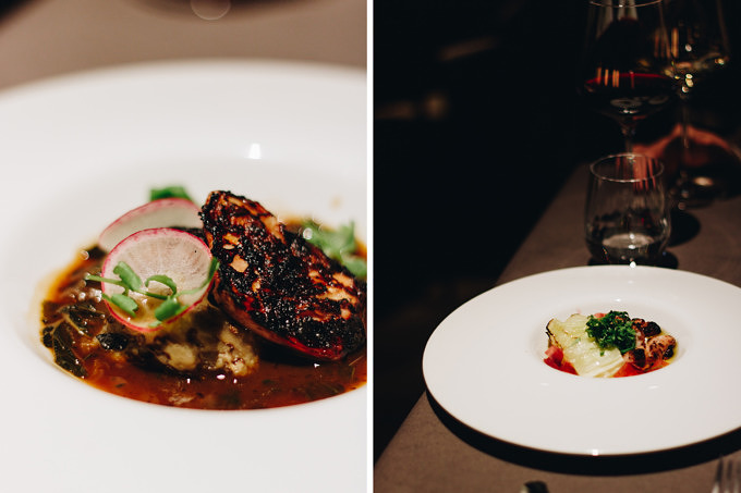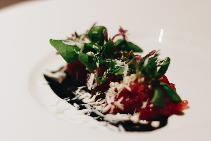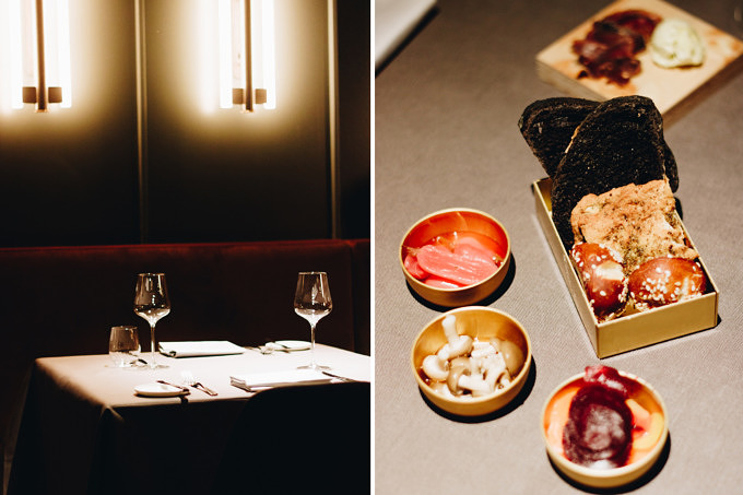 Im Prism dominiert die Farbe Anthrazit. Wände, Decke, Boden und Tischdenken sind in dem Dunkelgrau gehalten. Lediglich die mit orangenem Samt bezogene Sitzebänke an der Messingbar sorgen für etwas Farbe. Kühl und dunkel wirkt es hier aber nicht, dafür sorgen die warme Beleuchtung und die herzliche Begrüßung durch Gastgeberin Jacqueline und ihrem australischen Kollegen. Mit dem Brot kommt dann auch die erste Portion Farbe auf den Tisch: Eingelegtes Gemüse, schwarzes Schokoladen-Kaffee-Brot, Kamel-Pastrami und grüne Olivenbutter.