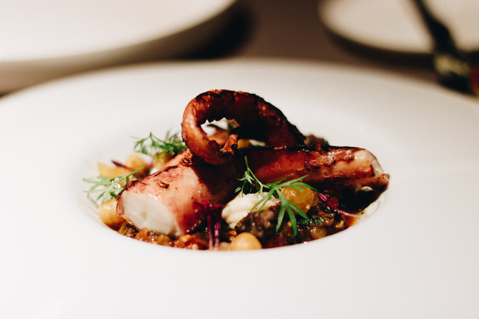 Auf unserem Tisch findet ein kulinarisches Fest statt. Links die Wachtel vom Holzkohlegrill, rechts die saftig-zarten Lammkoteletts mit vegetarischer Kohlroulade und mittendrin der gegrillte Pulpo mit Kichererbsen, Tomatensalat und püriertem Foul, weißem Bohnenmus. Während ich die kräftigen Grillaromen beim Pulpo und dem Lamm mag, sind sie mit bei der zarten Wachtel zu viel – den Gang überlasse ich meiner Begleitung. Den Teller mit dem Pulpo teile ich nur ungern. Sehr lecker.