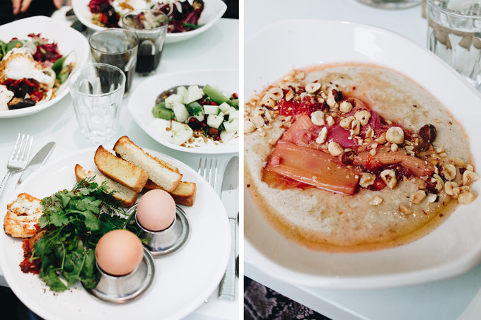 Wir bestellen den Breakfast Salade, einen Mix aus geröstetem Gemüse, Linsen, Graupen, frischem Salat und pochiertem Ei, das Safran-Blumenkohl Breakfast Sandwich mit Torshi (persisches eingelegtes Gemüse), Süßkartoffel und Tahini, das Sauerkirsch Granola mit Labneh, Kokosnusschiapudding, Kakaonibs und saisonalen Früchten, das Kuku Sabzi Omelette (richtig, das persische Gericht hatten wir damals gemeinsam gekocht) und das Dip it, zwei gekochte Eier mit Brioche, Halloumi und frischen Kräutern. Jedes Gericht ist mit einer geballten Portion Gewürzen und Kräutern versehen, sowas hat man in Berliner Cafés und Restaurants eher selten.