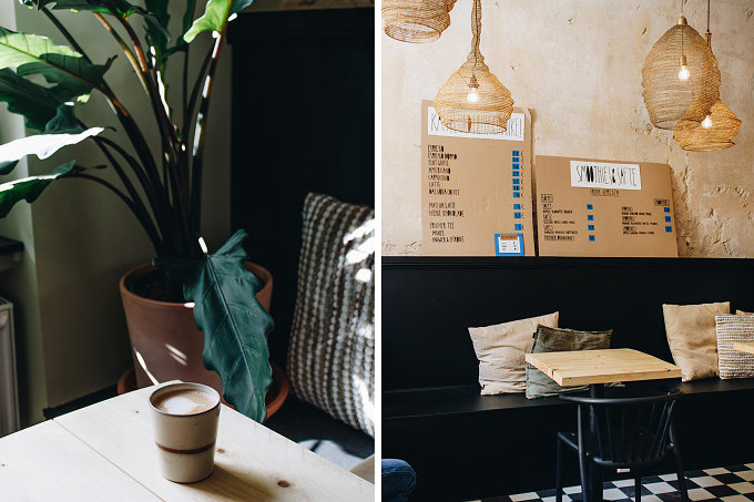Weil draußen alle Tische belegt sind (zum Zeitpunkt meines Besuchs hatten wir noch über 20 Grad), machen wir es uns am Tisch direkt am Fenster, umgeben von Pflanzen, bequem. Von der Sitzbank aus hat man einen guten Überblick über das Kaffee. Wer lieber rausschauen will, kann sich einen der Barhocker vor dem großen Fenster neben der Theke sichern.