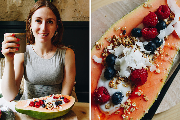 Unbedingt probieren: Das Granola mit Kokosjoghurt in der halben Papaya – hab ich so bisher noch nie gesehen.