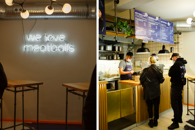 Bereits von Weitem erkennt man den frisch gestrichenen, weiß-blau gefleckten Laden, das Leuchtschild tut sein Übriges und die hübsch gestrichenen Bänke, die sich auf dem breiten Bordstein verteilen, lassen einem quasi keine andere Wahl, als sich auf ein kleines Köttbullar-Date einzulassen. Ähnlich wie bei einem Imbiss wird drin am Tresen bestellt und direkt bezahlt, wenn euer Essen fertig ist, wird die Nummer auf eurem Bon aufgerufen und ihr könnt euch das Essen abholen. Betritt man den Laden, leuchtet einen von rechts direkt das Mantra des Ladens entgegen: We love meatballs! Und es leuchtet einem auch gleich noch etwas entgegen: wahnsinnig freundliche Gesichter, denn hier im Laden sind alle sehr nett und herzlich. Wie sehr die Boys und Girls Fleischbällchen wirklich lieben, zeigt sich in der Karte, denn genau genommen gibt es tatsächlich nur ein Gericht auf der Karte: Köttbullar.
