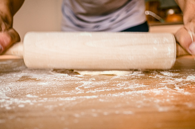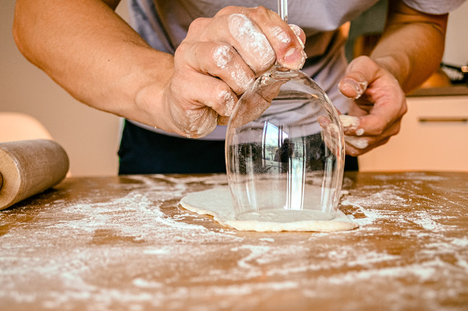 Als erstes wird der Teig gemischt, weil er eine Weile gehen muss. Normalerweise vermengt man Mehl, Wasser, Salz und ein Ei zu einem glatten Teig, aber es geht auch gut ohne Ei. Ihr könnt zum Beispiel Sojamehl verwenden, dann hält der Teig besser zusammen.