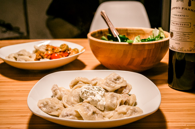 Zwei Dinge, die ich erst letzte Woche gelernt habe: Russisches Essen muss gar nicht super Fleisch-lastig oder schwierig zu kochen sein! Ich bin ja noch ziemlich neu im Küchengame und pflege eine tiefgreifende Aversion gegen komplizierte Rezepte – liebe aber Pelmeni. Und siehe da: sie sind gar nicht so schwer herzustellen wie ich dachte und man braucht dafür auch nur wenige Zutaten. Außerdem kann man Pelmeni mit fast allem füllen – Kreativität ist angesagt, das gefällt mir. Was mir auch gefällt ist die Gemütlichkeit, die das Rezept fordert, denn bis alle Pelmeni fertig sind, dauert es eine Weile. Mit ein zwei Gläschen Wein, ist es die schönste Beschäftigung an einem trüben Nachmittag.