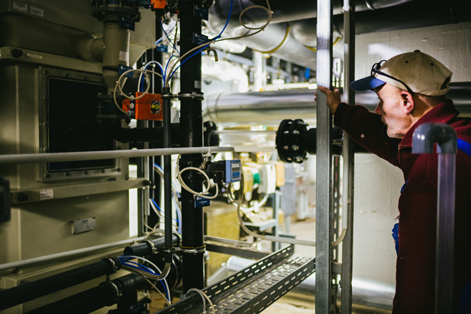 06.20 Uhr: Um diese Wasserproben zu nehmen, gehen wir in die Katakomben des Schwimmbades – als ich das letzte Mal in den Katakomben eines Schwimmbades war, gab es das Stattbad Wedding noch und ich sag es mal so, da hätte man auf andere Sachen getestet. Unten treffen wir Zottel, er arbeitet seit über 40 Jahren als Maschinist bei den Berliner Bäderbetrieben, kümmert sich darum, dass alle Pumpen regelmäßig gereinigt werden, der Wasserstand und alles stimmt.