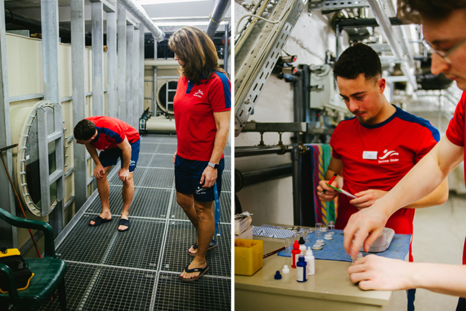 10.00 Uhr: Die Azubis Philipp und Janes sammeln mich ein und zeigen mir den Rest des Bades sowie ihre anderen Aufgaben. Die Wasserqualität muss mindestens drei Mal am Tag kontrolliert werden, zwar macht das natürlich auch eine Maschine, weil die aber auch mal Unrecht haben kann, wird das auch händisch nachgeprüft. Wir gehen also wieder runter in die Maschinenräume und nehmen Wasserproben. Getestet wird der Ph-Wert, das freie Chlor (also Chlor, das noch Schadstoffe binden kann) und das gebundene Chlor (Chlor, das bereits Schadstoffe gebunden hat). Statt in einen Computer, schreiben wir das Ganze auf einen Zettel. In ein Buch. Und in noch ein Buch. Safety first, auf die Zukunft der Technologie wird hier allerdings noch nicht in allen Bereichen gesetzt. "Was hat euch beide eigentlich dazu gebracht eine Ausbildung als Bademeister anzufangen?", frage ich Janes und Philipp, beide haben zuvor ein Studium angefangen oder bereits eine andere Ausbildung gemacht. "Das hier ist ein sicherer Job, man ist im öffentlichen Dienst, da ist für einen gesorgt. Außerdem macht mir schwimmen Spaß und nach der Arbeit Sport treiben zu können – wir haben hier auch ein kleines Fitnessstudio, das wir nutzen können – ist schon ziemlich genial", erklärt mir Philipp. "Bei mir ist das ähnlich, ich war vorher bei der Bundeswehr, hab' eine Ausbildung als Koch gemacht, das war ziemlich hart. Hier ist alles etwas entspannter, die Leute sind nett und wir können fast jeden Tag schwimmen gehen", meint Janes.