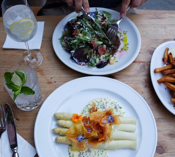 Wenn es euch so geht wie uns und die österreichische Küche euch ein Gefühl von Gemütlichkeit und Wohlbefinden vermittelt, dann probiert doch mal das Jolesch aus. Ein bisschen Österreich-Feeling mitten in Kreuzberg. Auf der Karte gibt es Klassiker und moderne Kreationen wie etwa die vegane Version des Wiener Schnitzels (aus Tempeh) mit Erdäpfelsalat. In dem mit dunkelgrünen Wänden und viel Holz versehenen Raum kann man bei gedimmtem Licht ungestört über (unglaublich gutes) Wiener Schnitzel, Tafelspitz, Käsespätzle und natürlich Kaiserschmarrn herfallen. Besonders cool: Auf Wunsch kann das Schnitzel auch glutenfrei zubereitet werden. Wenn es kälter wird, sitzt man drinnen und lauscht dem Knistern des Kamins, bei den sommerlichen Temperaturen ist es auf der Straßenterrasse unschlagbar schön. Zum Ende des Jahres gibt's hier auch Gans auf der Karte.