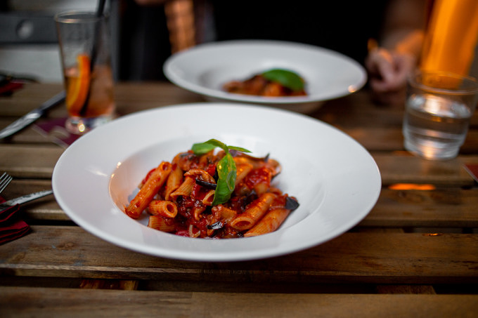 Zum Hauptgang serviert uns Alexandria Pasta und zwar das Ragú Vegetariano, also eine Tomatensoße mit saisonalem Gemüse, die zwölf Stunden lang geköchelt hat. Vielleicht ist das eines der Geheimnisse guter Tomatensoße: Zeit! Zumindest habe ich außerhalb Italiens selten eine so fantastische Pasta gegessen. Die Aubergine ist butterweich, der Tomatensugo schön fruchtig und alles wird umhüllt von einer fantastischen Olivenöl-Note. In Berlin wirklich leckere Pasta zu bekommen, die perfekt al dente gekocht ist und bei der sich die Soße ganz samtig an die Nudeln schmiegt, ist nicht unbedingt einfach. Zu oft bekommt man entweder zerkochte Nudeln oder mittelmäßige Soßen, die dann unter einem Berg mittelmäßigen Parmesans begraben werden. Umso mehr freue ich mich also, mit dem Partenope #081 vielleicht ja meinen neuen Pasta-Dealer gefunden zu haben. Denn das einzige, was an diesem Gericht gefehlt hat, ist vielleicht ein bisschen Brot, um auch noch die letzten Tropfen der Soße futtern zu können.