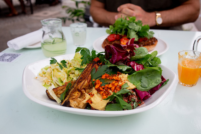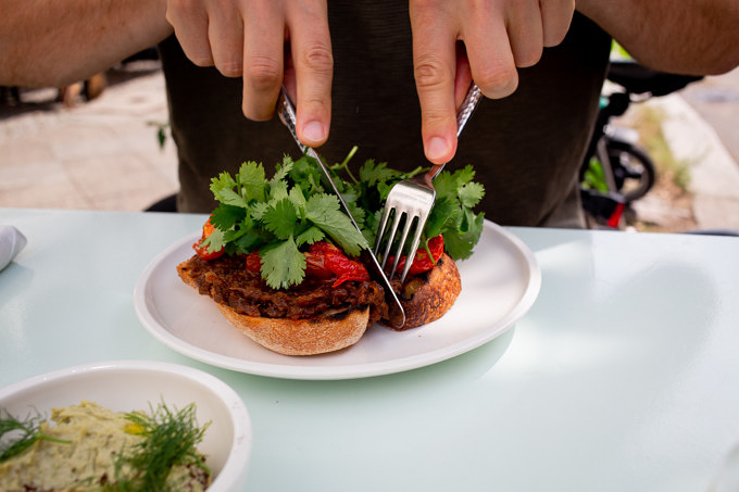 Mindestens genauso lecker und aufregend kommt der (vegane) Summer Toast daher. Auf frischem und sehr krossem Sironi-Brot buhlen jede Menge Zwiebelchutney (das so lecker zubereitet ist, dass die Zwiebeln keine Schärfe, sondern ausschließlich fantastisches würziges Aroma entfalten), geröstete Kirschtomaten und ein anständiger Haufen Koriander um unsere Aufmerksamkeit – wir haben uns sofort in die für uns völlig neue Kombination verliebt. Zu guter Letzt kommt noch der regelmäßig wechselnde Salat ins Spiel: Bei unserem Besuch hüpfen zu knackigem Blattsalat, eingelegter Kohl, geröstete Aubergine, Hummus sowie roter Reis in die Schüssel und von allem so reichlich, dass wir ihn kaum aufessen können. Jede Komponente für sich schmeckt ziemlich lecker, am allerbesten hat es allerdings geschmeckt, wenn man es geschafft hat, von allem etwas auf die Gabel zu bekommen.