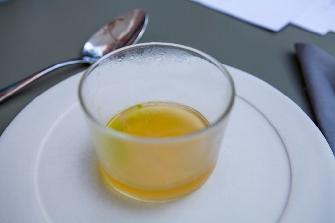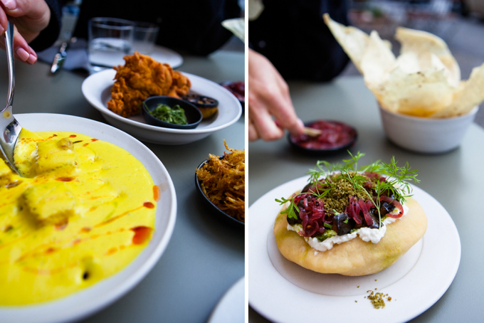 Begeistert von den neuen Geschmäckern, stürzen wir uns auf die srilankische Pizza. Gebratene Auberginen und cremiges Burrata sind auf Batura gebettet, ein frittiertes Fladenbrot. Weil hier besonders bei Fisch und Gemüse nach Saison gekocht wird, finden sich immer wieder abwechselnde Gerichte auf der Karte. Gut für uns, wir bekommen einen veganen Maisschaum mit Kokosmilch, dem Curry und Safran die satte gelbe Farbe verleiht. Darin tummeln sich Polenta-Würfel und gelbe Rosinen.