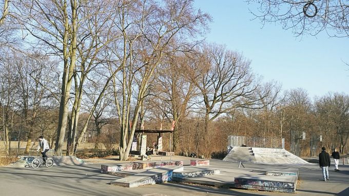 Der Skatepark Hasenheide am Columbiadamm 184 besteht neben der steilen Quarter aus einem Stück der Berliner Mauer, Banks, einem gebogenem und einem geraden Rail sowie einer Vielzahl an Curbs. Hier könnt ihr euch auf großer Fläche an den zusammengesetzten Obstacles austoben oder endlose Lines fahren. Oder ihr schnappt euch einen Basketball und lasst ein paar Dribblings. Direkt neben dem Skatepark sind nämlich auch Tischtennisplatten und eben zwei Halfcourt-Basketballkörbe – leicht schief zwar, aber immerhin mit Platten und Netzen.