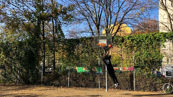 Der Park am Gleisdreieck war am Anfang sehr umstritten. Eigentlich hat niemand ein gutes Haar an dem Projekt gelassen. Zu sehr Reisbrett, gleichzeitig nicht durchdacht, wird niemand nutzen. Inzwischen ist hier immer etwas los. Leute sonnen sich auf den Grünflächen, skaten oder spielen Basketball. An Freizeitangeboten mangelt es wirklich nicht, allein drei verschiedene Street Courts gibt es in dem begrünten Areal. Zwei einzelne Körbe neben dem Skatepark, ein Court unter der Monumentenbrücke und einer dahinter, im sogenannten "Nord-Süd-Grünzug". Hier kommt neben den vorbeirauschenden S-Bahnen auf dem Beton definitiv urbane Stimmung auf.