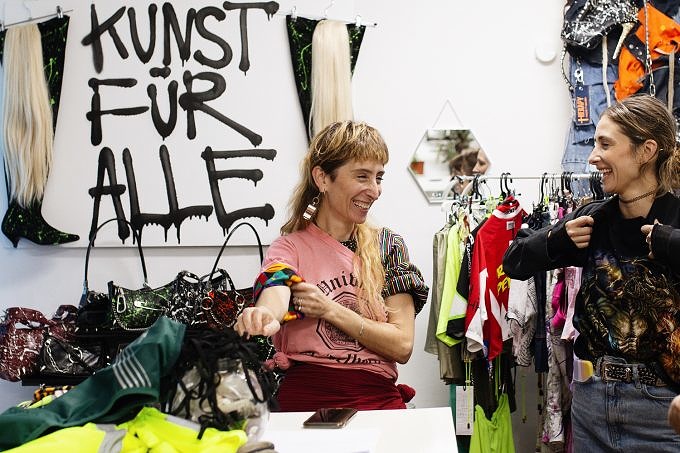 Frisch gestärkt beginnt dann um 17 Uhr die Bühne zu beben – eine Modenschau steht auf dem Programm. Keine Gewöhnliche, so viel ist sicher: Kreative Designer*innen haben den Handballspieler*innen der Berliner Füchsen mal unter die Arme gegriffen und sie von ihren Trikots erleichtert. Ebendiese sind Grundlage einer schmucken Upcycling-Kollektion, die hier zum allerersten Mal zu sehen sein wird.
