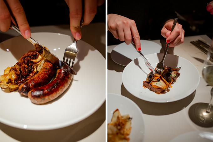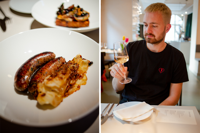 Was schon mal sehr lecker losgeht, wird nur noch von den großen Gerichten getoppt: Tempeh, Blaubeere, Pilze sowie Bratwurst, Spitzkohl, Chili. Der Tempeh ist, wie fast alles im Merold, selbst gemacht und schmeckt herrlich würzig. Auf ihm tummeln sich ein Karottenpüree, marinierte Pilze und fermentierte Blaubeermarmelade – geschmacklich ein wirklich harmonisches und ausgewogenes Gericht. Die Rindsbratwurst ist mit Chili verfeinert und schmeckt so unverschämt lecker, dass meine Begleitung am liebsten nach Nachschlag gefragt hätte. Zur perfekt gebratenen Wurst gesellen sich hausgemachter Senf und gegrillter Spitzkohl, der schön zart ist und würzig schmeckt.