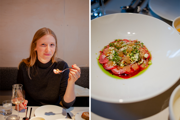 Die Karte ist sehr Berlin-typisch minimalistisch gehalten und verrät bei jedem Gericht lediglich drei Zutaten – in welcher Darreichungsform und Komposition sie dann auf dem Teller landen, erfahrt ihr entweder von dem sehr zuvorkommenden Personal oder ihr lasst euch eben überraschen. Thematisch sind die 11 Gerichte in Kleines, Großes und Süßes unterteilt, ein Drittel der Karte bleibt dabei übrigens immer vegetarisch bzw. vegan. Je nach dem, wie viel Hunger man mitbringt, sollte man mindestens zwei bis vier Gerichte pro Person bestellen. Wir entscheiden uns für das Sauerteigbrot, das vom Domberger Brotwerk stammt, mit Butter und Koji, weil ich mich vegan ernähre, gibt es außerdem kaltes Rapsöl zum Dippen. Dazu bestellen wir die Kombinationen Mais, Hefe und Bärlauch, was sich als Hefecreme umringt von Bärlauchöl, eingelegten Radieschen und gepopptem Mais entpuppt, sowie Lamm, Rhabarber, Tanne. Hinter Letzterem versteckt sich ein Lammtatar mit Tannennadeln und Pilzen, einem Schaum aus Rhabarber und Kaviar.