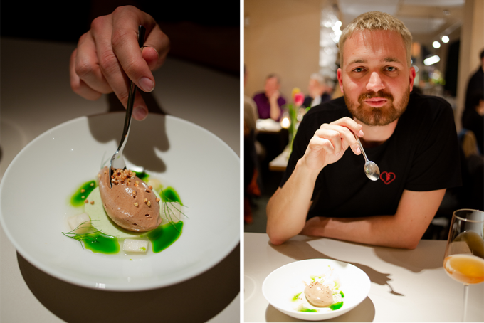 Auch beim Nachtisch werden wir vegan fündig: Haselnuss, Spargel, Dill steht auf der Karte. Was erstmal nicht unbedingt nach einem klassischen Dessert klingt, entpuppt sich als Haselnusseis, das so sehr nach besagter Haselnuss schmeckt, als hätte man frisches Nussmus einfach tiefgefroren. Gebettet ist das Eis auf einem Dill-Marshmallow und umringt wird es von Dill sowie frischen Spargelstückchen. Wir sind überrascht, wie gut das Ganze zusammen harmoniert, für den Dill sind wir allerdings noch nicht ganz bereit. "Da sind wir mithilfe des Feedbacks unserer Gäste noch in der Findungsphase, in welchem Verhältnis wir die Komponenten am besten vereinen", erklärt uns Besitzer Jonas. Dass wir bald wiederkommen, um uns erneut vom Nachtisch und allen anderen köstlichen Gerichten zu überzeugen, versteht sich von selbst, oder?
