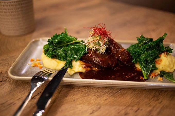 Da ich gerne mal Fleische esse, es deftig und herzhaft mag, fällt meine Wahl beim Hauptgericht auf die Kalbsbacke mit Grünkohlsalat und Kartoffelstampf. Für mich eine Kombination, die gerade jetzt im Winter perfekt harmoniert und mich mit einem warmen und satten Gefühl im Bauch in den Abend entlassen wird. Müsste ich nicht morgen früh raus – ich hätte ruckzuck am Hörer gehangen, um Freund*innen auf ein paar Drinks her zu locken, denn die Cocktail-Karte liest sich fantastisch.