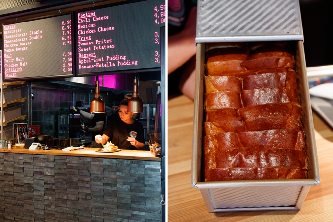 Natürlich probieren wir eines der Melts und entscheiden uns für den Patty Melt mit selbstgewolftem Rindfleisch, den veganen Beyond Meat-Burger und den Double Cheeseburger. Dazu Loaded Fries und Süßkartoffel-Pommes mit Apfelmus. Letzteres ist übrigens eine geniale Kombi und wir fragen uns seitdem, warum wir da nicht selbst draufgekommen sind?! Aber zurück zu den Burgern und Melts. Sowohl Bun als auch Brioche sind schön fluffig und an Butter wurde hier nicht gespart. Warum auch? Butter macht schließlich alles besser! Das Fleisch ist eher grob gewolft, dabei auch schön zart und super saftig. Mein Burger ist üppig mit Salat, einer dicken Scheibe Tomate und Gewürzgurken belegt. Obwohl der Double Cheeseburger eine ordentliche Portion ist, fühle ich mich danach nicht unangenehm voll, Platz für eines der beiden Desserts ist aber trotzdem nicht.