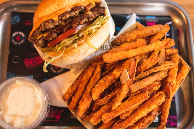 Veggie: Es gibt einen veganen Burger mit Beyond Meat und Pommes.