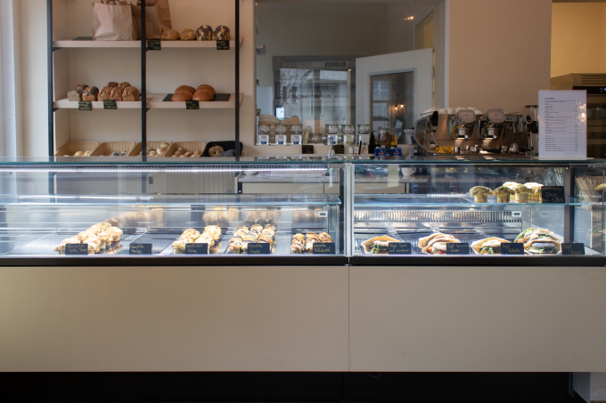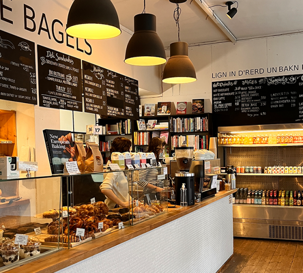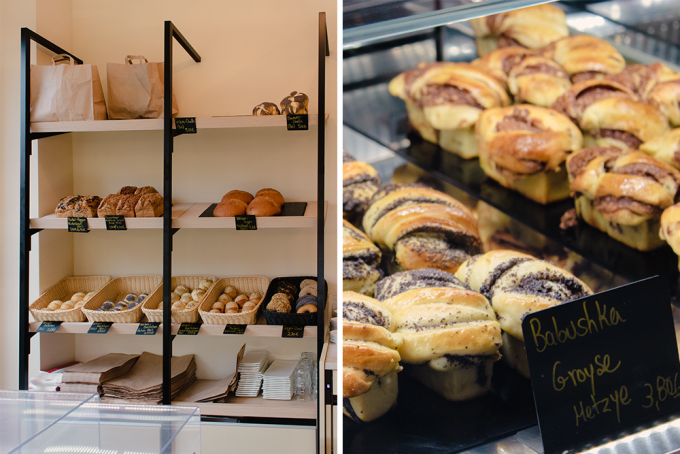Nicht nur Süßmäuler kommen hier auf ihre Kosten, es gibt auch herzhafte Kräntze und belegte Bagel, zum Bespiel mit Sabich oder Pesto und Zucchini. So gut wie alle Zutaten sind hier übrigens bio. Es gibt nur wenige Ausnahmen, darunter die aus Israel importierte Halva und Tahini. "Hier ist uns der Geschmack wichtiger. Außerdem läuft das mit den Bio-Zertifizierungen in Israel etwas anders", erklärt uns Rotem. Seit Anfang Februar gibt es bei Babka & Krantz unter der Woche auch einen Mittagstisch. Lange hat Shahar nach einer Unterstützung in der Küche gesucht, bislang hat er alles alleine gemacht. Die neue Chefköchin versorgt die Gäste nun mit warmen Gerichten. Wir kommen definitiv zurück, kaufen unsere Challah für den Shabbat, Babushkas und Kräntzchen zum Naschen und probieren die Suppe im Brot. Außerdem freuen wir uns schon wieder auf das breite Lächeln von Rotem, wenn sie uns und ihre Stammgäste begrüßt.