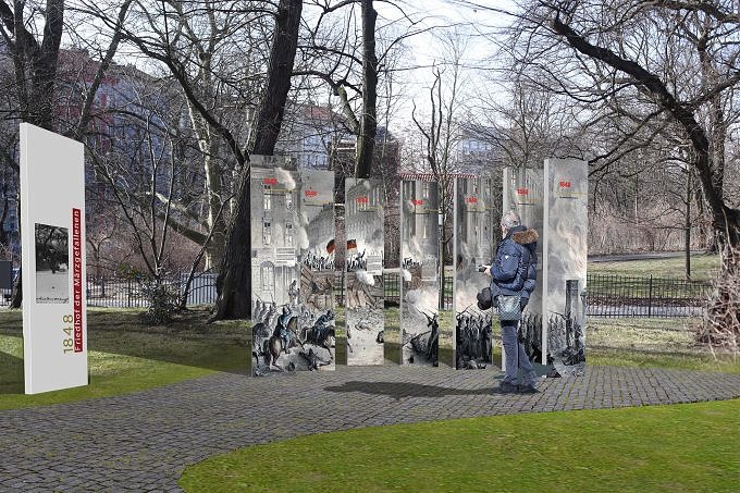 Hier ist auch der Startpunkt eines weiteren Highlights, das ihr nicht verpassen solltet: Dank der Arbeit des Künstlers Jim Avignon habt ihr von der Barrikade aus die Möglichkeit, mit der App "Artivive" die Geschichten von zehn Protagonist*innen der damaligen Zeit zu erleben. Vom Barrikadenkampf über Zufallsopfer bis hin zur engagierten Demokratin oder einem Soldaten werden euch so in kleinen Filmen die verschiedenen Aspekte der Revolution nähergebracht.